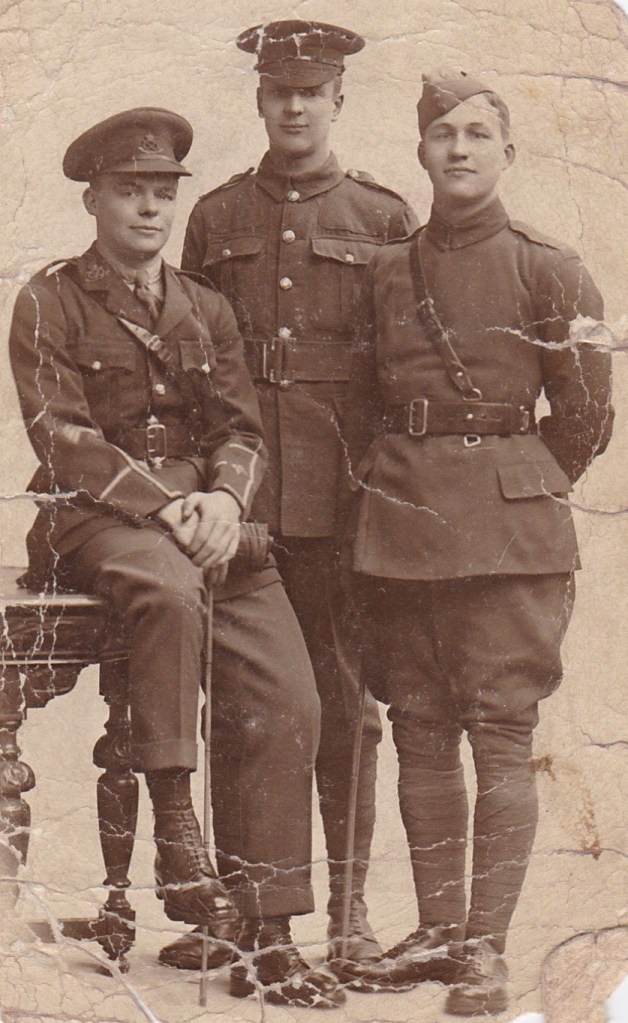 This photograph was probably taken in c1917 – the seated character is unknown; standing centre, Charles in the uniform of the Welsh Guards; standing right, Alf in the uniform of the Royal Flying Corps (RFC)