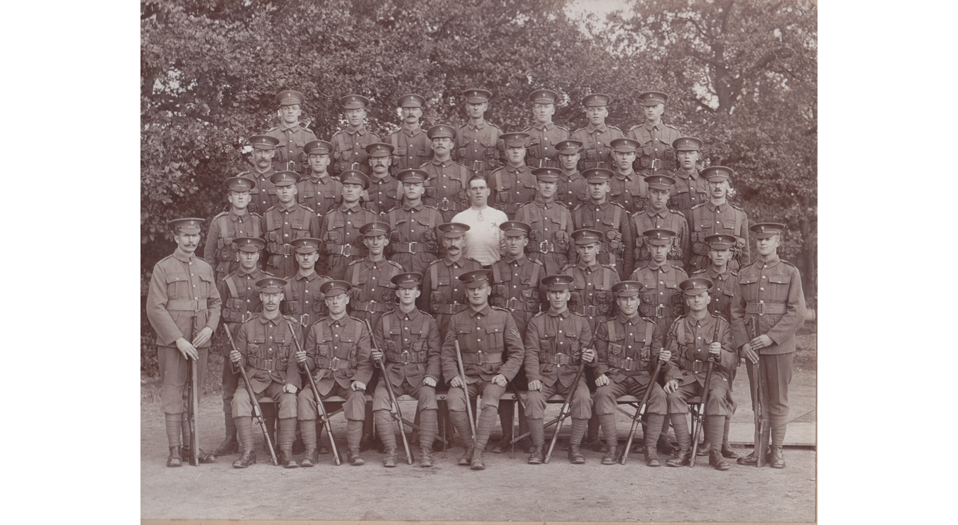 I found the above picture of my father’s training squad in pristine condition below the brown paper lining of a wardrobe drawer while helping my mother clear out her belongings before she went into a nursing home. I did not know it existed until that moment – my father obviously put it there when he returned home from France in December 1918 and it never saw the light of day again. The picture is now framed and is displayed in our home in West Sussex.